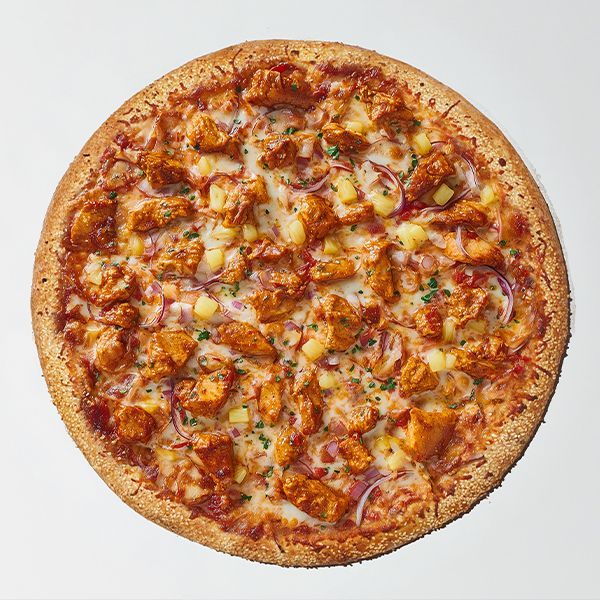 Butter chicken sauce, mozzarella, chicken, pineapple, red onion, chopped cilantro