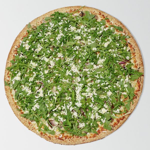 Alfredo Base, Mozzarella, Mushrooms, Feta, Roasted Garlic, Red Onions, Olive Oil Drizzle