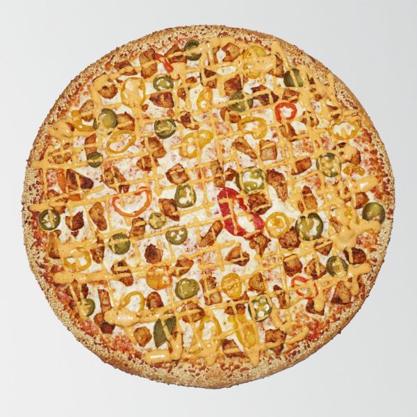 Tomato base, Mozzarella, Grilled chicken, Banana peppers, Jalapeño peppers, Chipotle drizzle